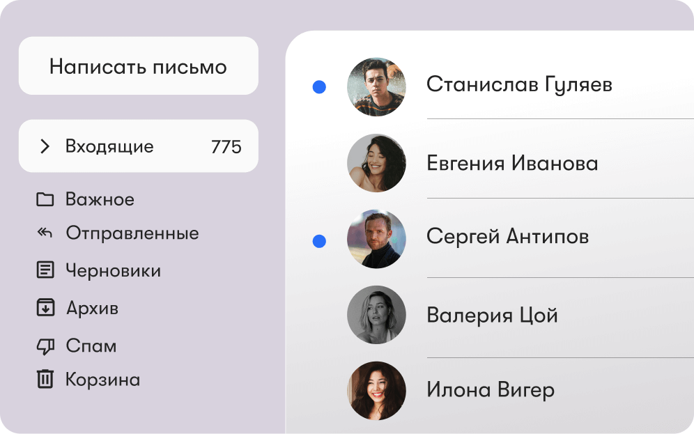 Подключайте свой домен и добавляйте любое количество пользователей. Объём почтового ящика не ограничен.